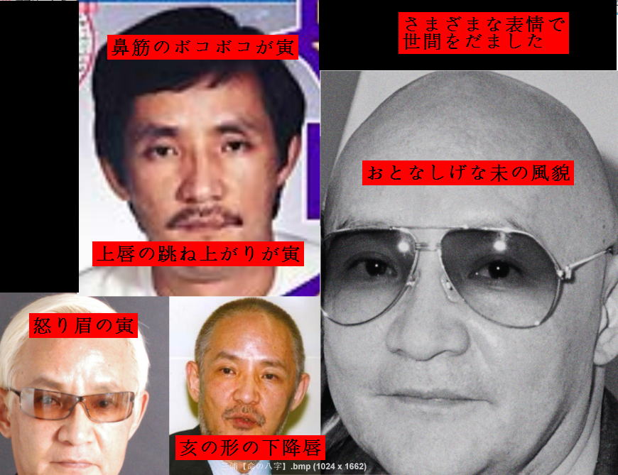 | 左右の鼻甲に 勢いがある それが 寅です 同時に 上唇は めくれあがる はねあがる 勢いがあれば 寅と断じていい これは 寅が二つある お顔です 左右の口角も 吊り上る ![]() ▼▼▼▼▼▼ 誕生日は 甲寅日ですが ちがいますね 寅の左右口角は 釣りあがるけど マッチャンのは 口角が 垂れています ![]() ばたばたと 落ち着きがないですから 申があると推測します すると 生まれた時間が 庚申刻かも 生まれた日は 癸丑日かも 寅が三個ですが 卯もあるので 口が パカッと開きます ![]() 生まれた時間は 庚寅刻ですね。 ![]() 目尻も 吊り上れば 寅 まちがいなし ![]() ◎◎◎◎◎◎◎◎◎◎◎◎◎◎◎◎◎◎◎◎◎◎ 寅 亥 そして 卯 目尻は 卯が 勝っていますね ![]() 三浦さんには 午があります 本来は 午は なにもかも膨張して 垂れて下がる傾向ですが 垂れないで 引き締まっていますから それは 寅のせいです |