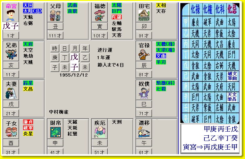 命宮 戊から 化禄星は 貪狼星へ 貪狼星は 芸能界 娯楽など 中村梅雀さんの お顔もですね |